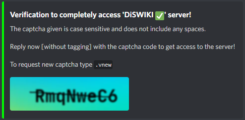Answer : DiSWIKI's captcha verification system has been carefully drafted to secure your server from bot users. The captcha needs to be entered in DMs which prevents many server based bots. The captchas are carefully drafted , made case sensitive , striked through and blured to prevent image OCR.